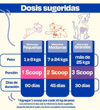 Administrar gradualmente por 4 días hasta llegar a la dosis diaria recomendada según el peso del perro.