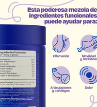 Esta poderosa mezcla de ingredientes entre ellos Glucosamina, Colágeno UC-II,MSM y Condroitina puede ayudar a reducir la inflamación, mejorar la movilidad y proteger el cartílago en las articulaciones de los perros. (También promueve la regeneración de cartílago).